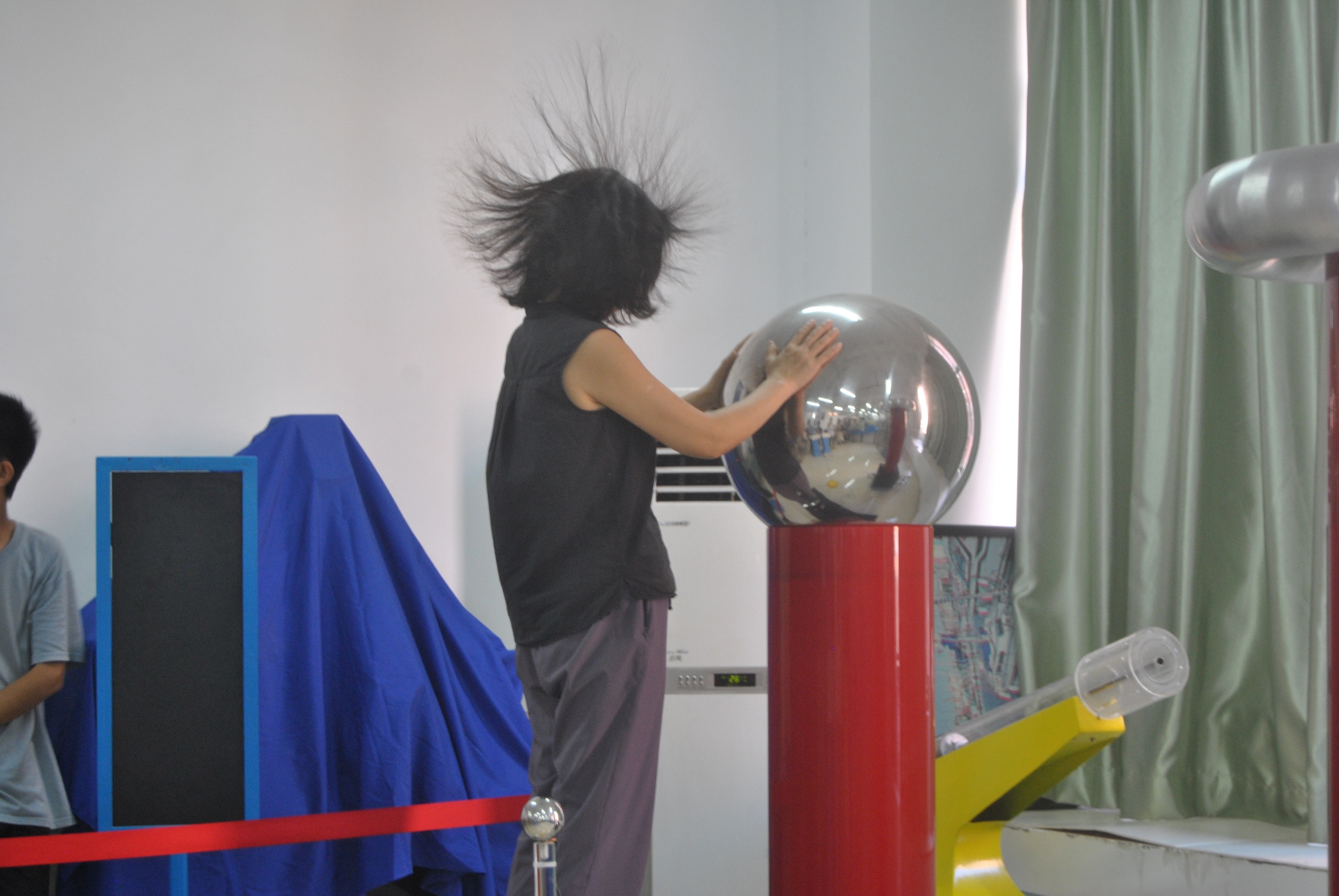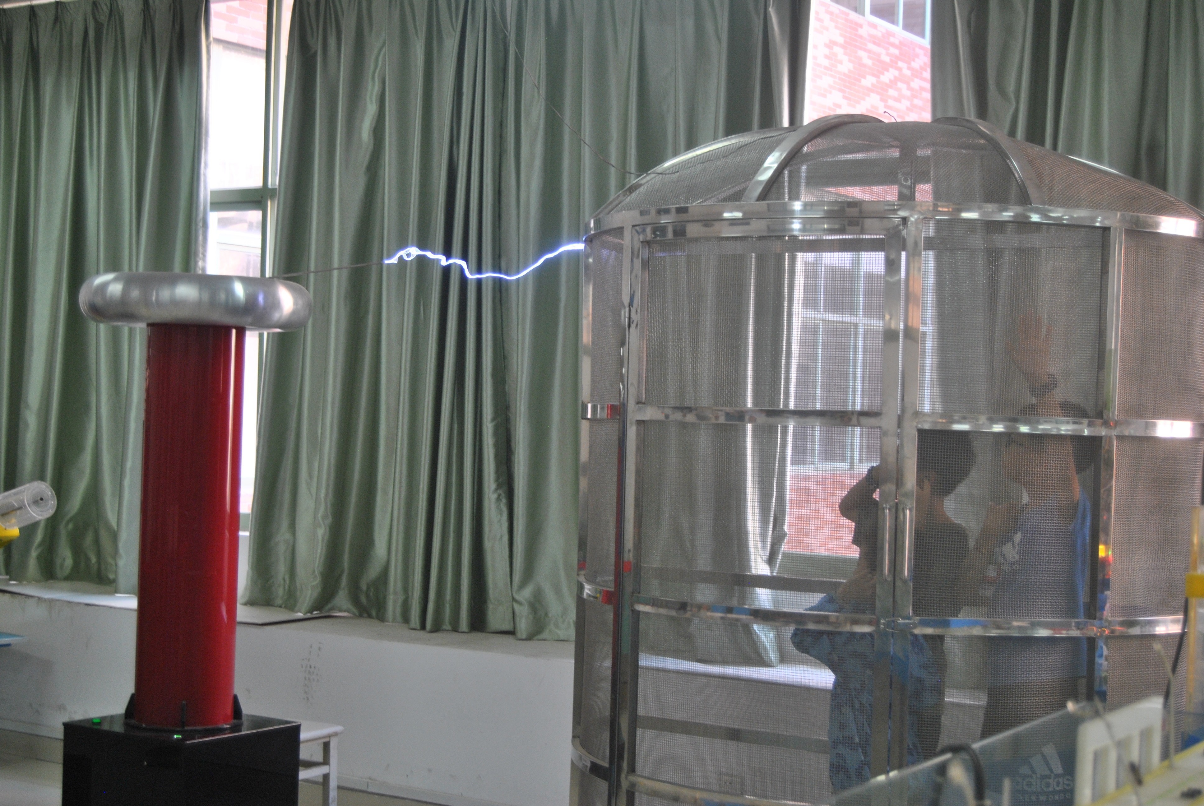 电磁学系列实验尤为引人注目。在“电磁感应”装置前,同学们亲手摇动线圈,使灯泡在没有电池的情况下亮起,亲身体验了法拉第发现电磁感应时的激动瞬间。“法拉第笼”演示则将现场气氛推向顶峰——当志愿者置身金属笼内,外部高压静电迸发出耀眼的电火花,而笼内的他安然无恙,甚至能安全触摸笼壁,引来阵阵惊叹与掌声。最后,同学们将手轻触“静电球”,眼见发丝根根竖起,在欢声笑语中深刻理解了静电现象。