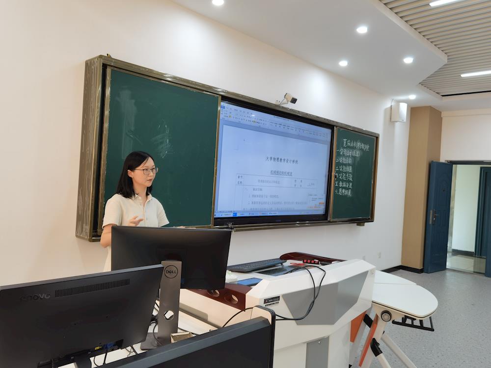 然后,颜超老师从理论教学方面给出了她的教学设计案例,具体以“简谐振动的认识和描述”混合式教学设计进行了报告。颜老师在线上线下混合教学方面经验丰富,并且运用多年,效果显著。她从学生线上课前预习,让学生通过视频了解下一节课的知识点,并通过选择题来检测预习效果,让学生在自己预习过程中提出自己的难点和问题。课堂上,通过简谐振动的生活现象和研究历史,带领学生进入知识点学习。课中,通过遴选前期学生提出的难点问题进行讲解。更深一步设置讨论题,让学生考虑弹簧串并联的情况下,物体的振动状态。课后通过习题作业和开放课题,来让学生全流程参与学习。颜老师谈到,通过这样的课程教学,学生的参与感有了显著提高,促进了学生良好学风的养成。