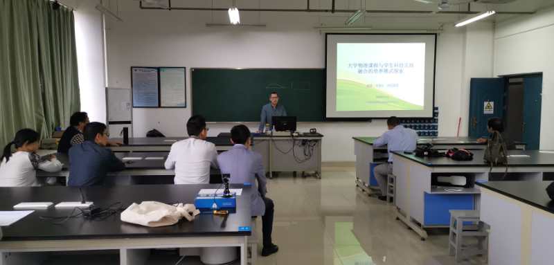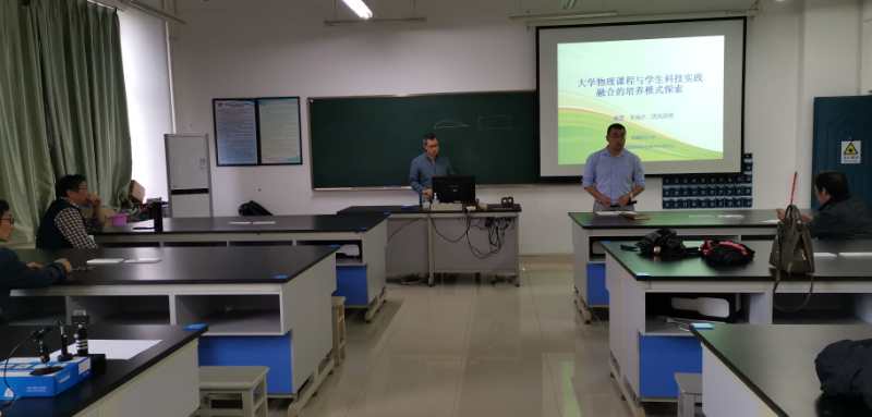 2020年10月15日大学物理实验中心在综合实验楼南405开展了系列物理教学研讨会,本次教学研讨会由黄彦老师介绍在大学物理实验中心开展物理课程教学和学生科技制作融合培养方面的经验。会上黄彦老师介绍他是如何通过演示实验仪器和社团活动将课堂教学、社团活动和学生科技制作和科技竞赛结合起来,并介绍了在指导学生科技竞赛中的经验和教训。
